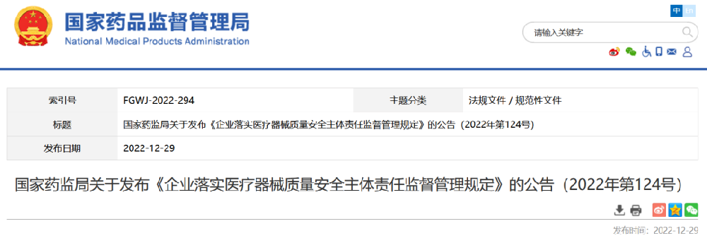 2023-02-102022年12月29日,國家藥品監(jiān)督管理局發(fā)布《企業(yè)落實(shí)醫(yī)療器械質(zhì)量安全主體責(zé)任...